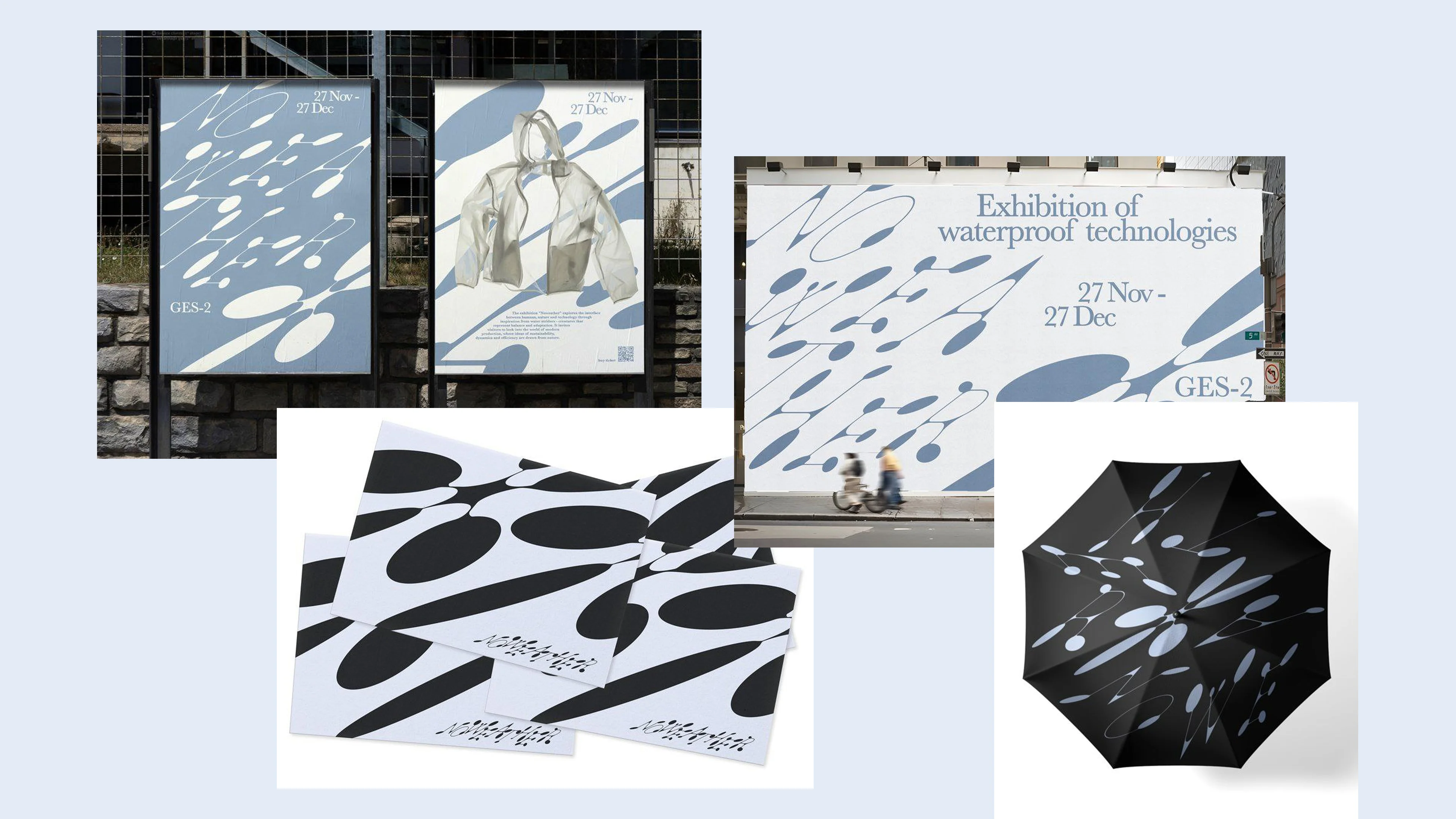 Айдентика выставки водонепроницаемых технологий, основана на метафоре водомерки: её силуэт через преломление света образует на дне водоёма эллипсовидные тени.