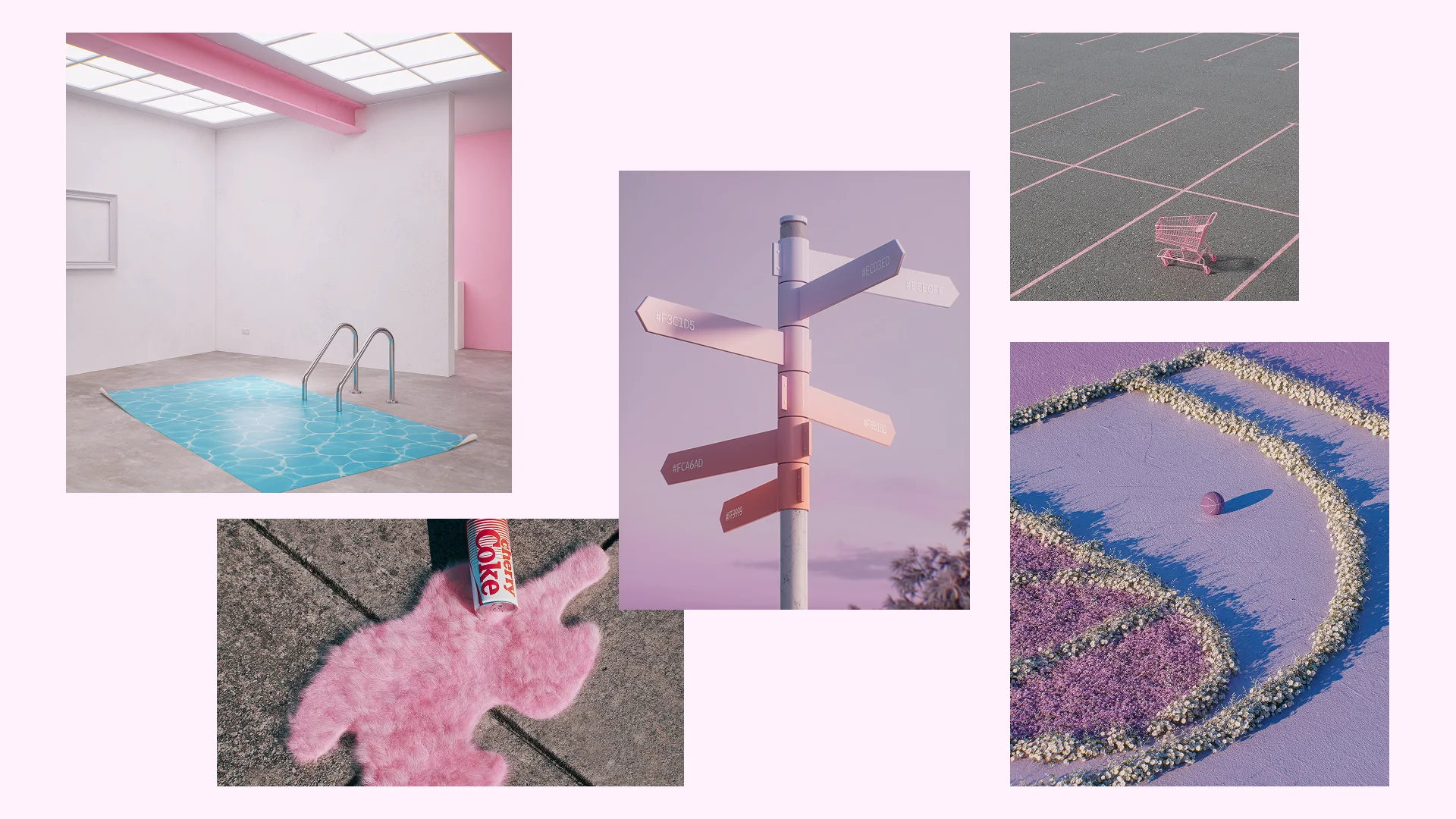 Привычные сцены слегка искажённые создают спокойный диссонанс. Предметы оказываются не на своём месте, пространства неожиданно пустеют или переполняются, а всё вокруг выглядит, словно розовый сон — едва уловимо, но необычно.
