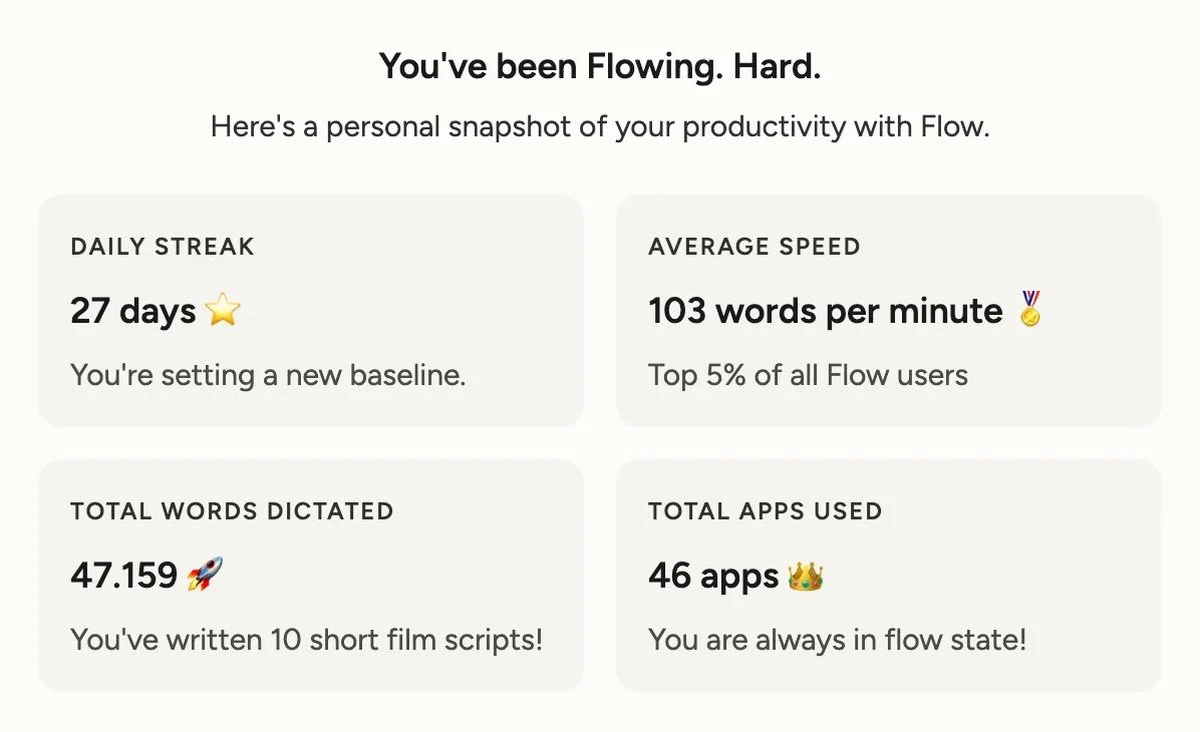Особенно удобно на английском. Мой английский не идеальный, но WhisperFlow как будто доосмысливает сказанное — и на выходе получается нормальный текст. Разработчики говорят про ускорение в пять раз, я бы сказал — раза в два точно. Но даже это меняет всё.