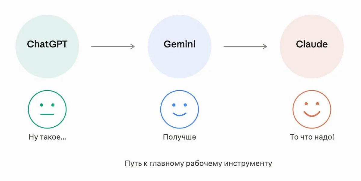 Мой путь был стандартный: сначала ChatGPT, потом Gemini, теперь Claude. Каждый следующий инструмент нравился больше предыдущего — и пока я остановился на Claude.
