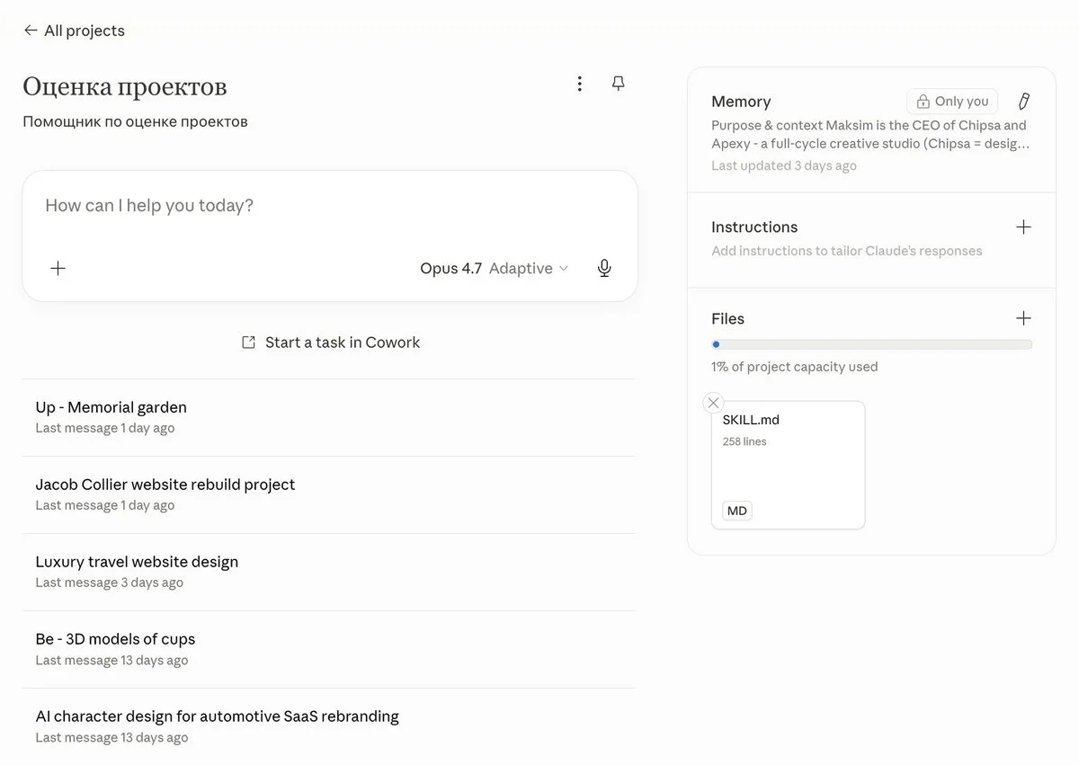 Я сделал скилл — кастомный промпт внутри Claude Projects — специально под оценку входящих проектов. Туда зашит наш бизнес-процесс, шаблон ответа клиенту, логика округления часов и стоимостей.