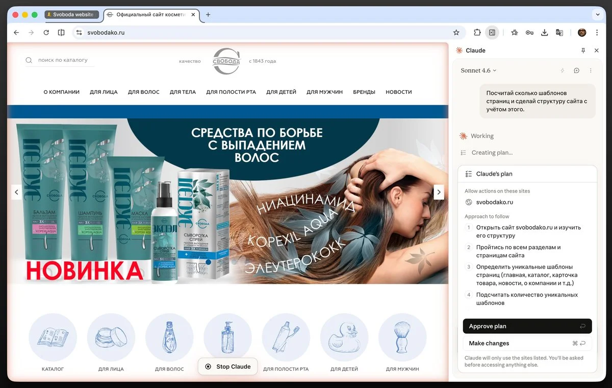 Я использовал это для анализа сайта фабрики Свобода — большой сайт, вручную просматривать страницы было бы долго. Написал ему: пройдись по всему сайту и посмотри типы страниц. Он начал ходить и смотреть, я оставил это фоном и занялся другими делами. Потом проверил — распределил правильно, с парой небольших правок.