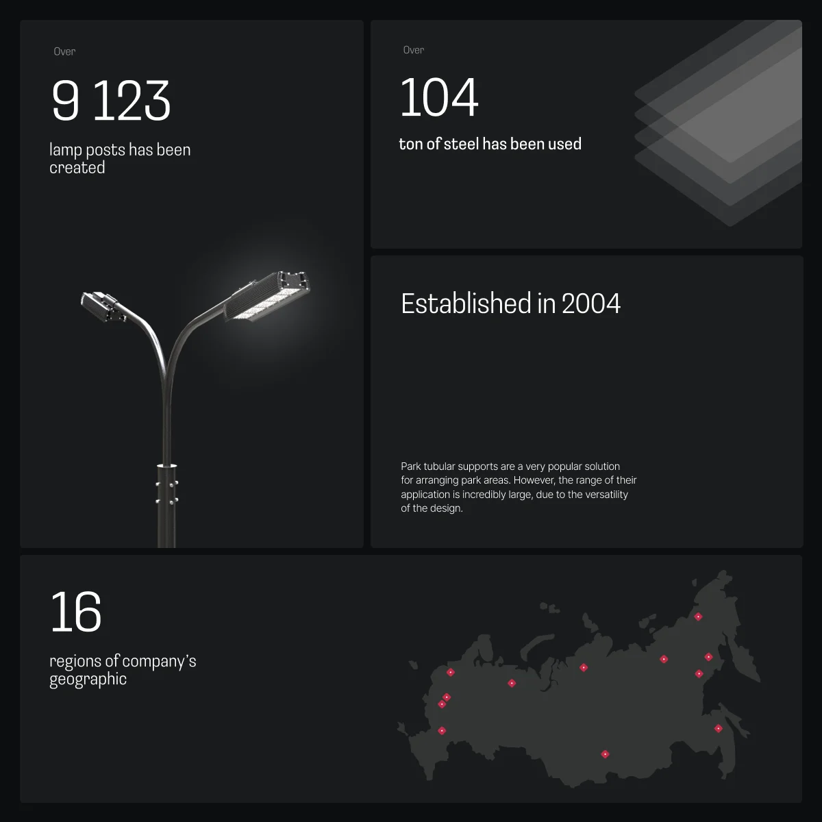 Компания производит опоры освещения. Вместо сложного описания — скролл-анимация всего цикла: от металла до готового изделия.