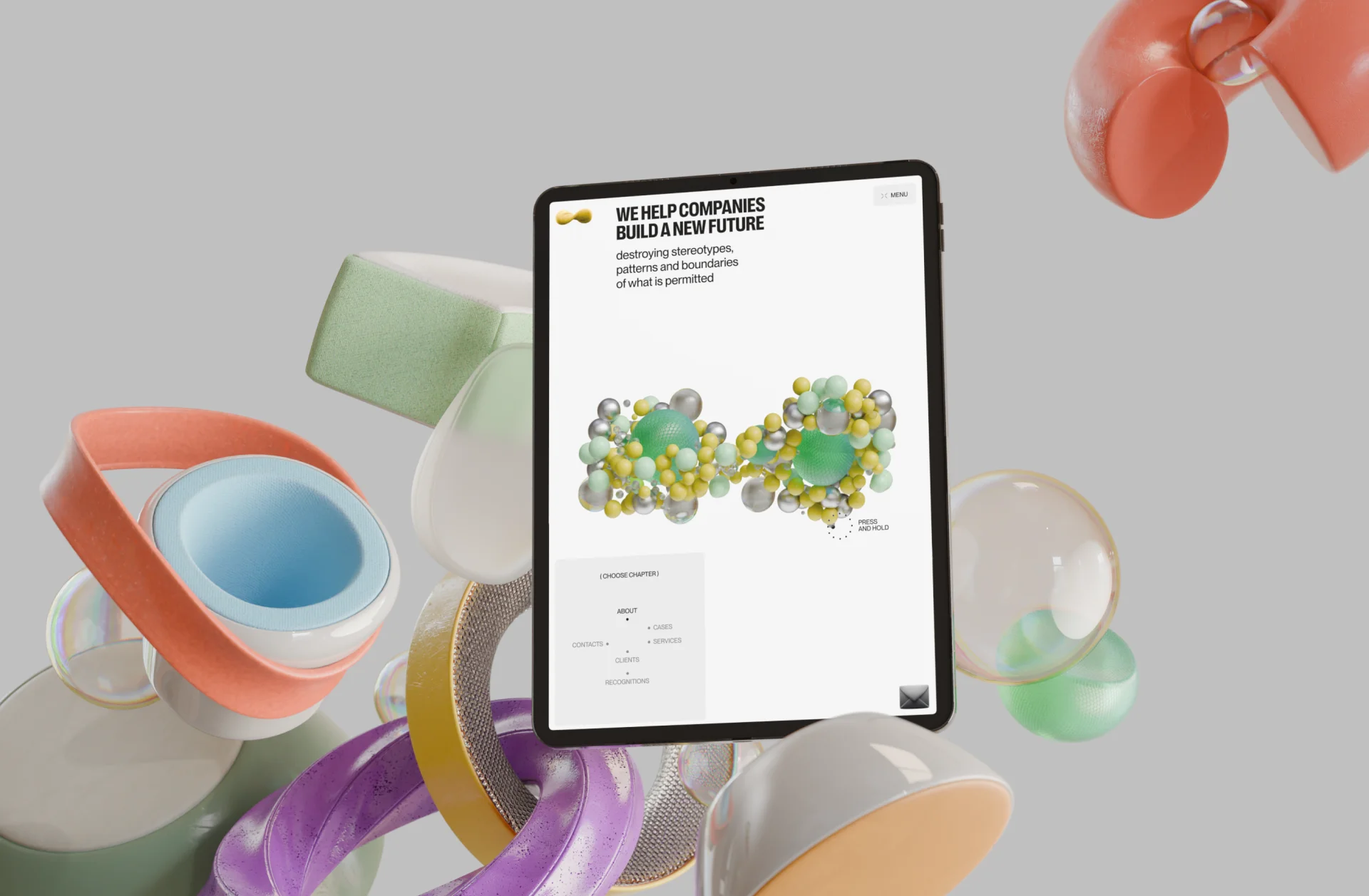 При этом мы снова отталкивались от принципа «не делать как у всех». Вместо того чтобы стартовать с ключевого визуала, мы создали множество разрозненных элементов, которые сошлись в единую экосистему. В центре должна была быть наша «чипсинка»: она планировалась интерактивной, меняющей материал при наведении — от каменного до бумажного, затем пластикового, стеклянного, металлического и так далее. Такой эффект с одной стороны производил бы вау-впечатление, а с другой — показывал бы нашу гибкость. К сожалению, из-за нехватки времени задумку пришлось временно отложить, но мы надеемся воплотить её в будущем.
