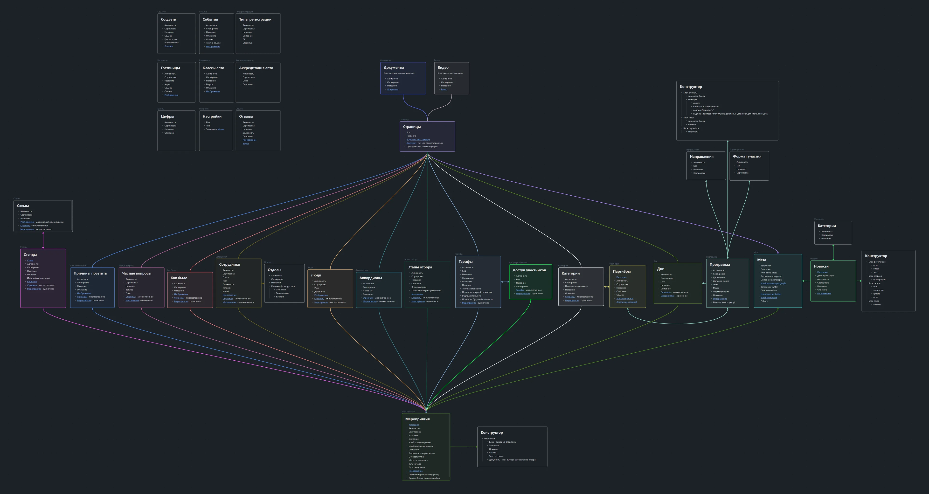 Из-за этого пришлось создавать админку с нуля, потому что механика блоков стала одинаковой и на основном сайте форума, и на сайтах других мероприятий. В итоге сделали много связей и пересечений, а все сущности соединили с каждой из имеющихся страниц. Теперь через админку можно редактировать буквально всё — вплоть до названий выводимых кнопок.