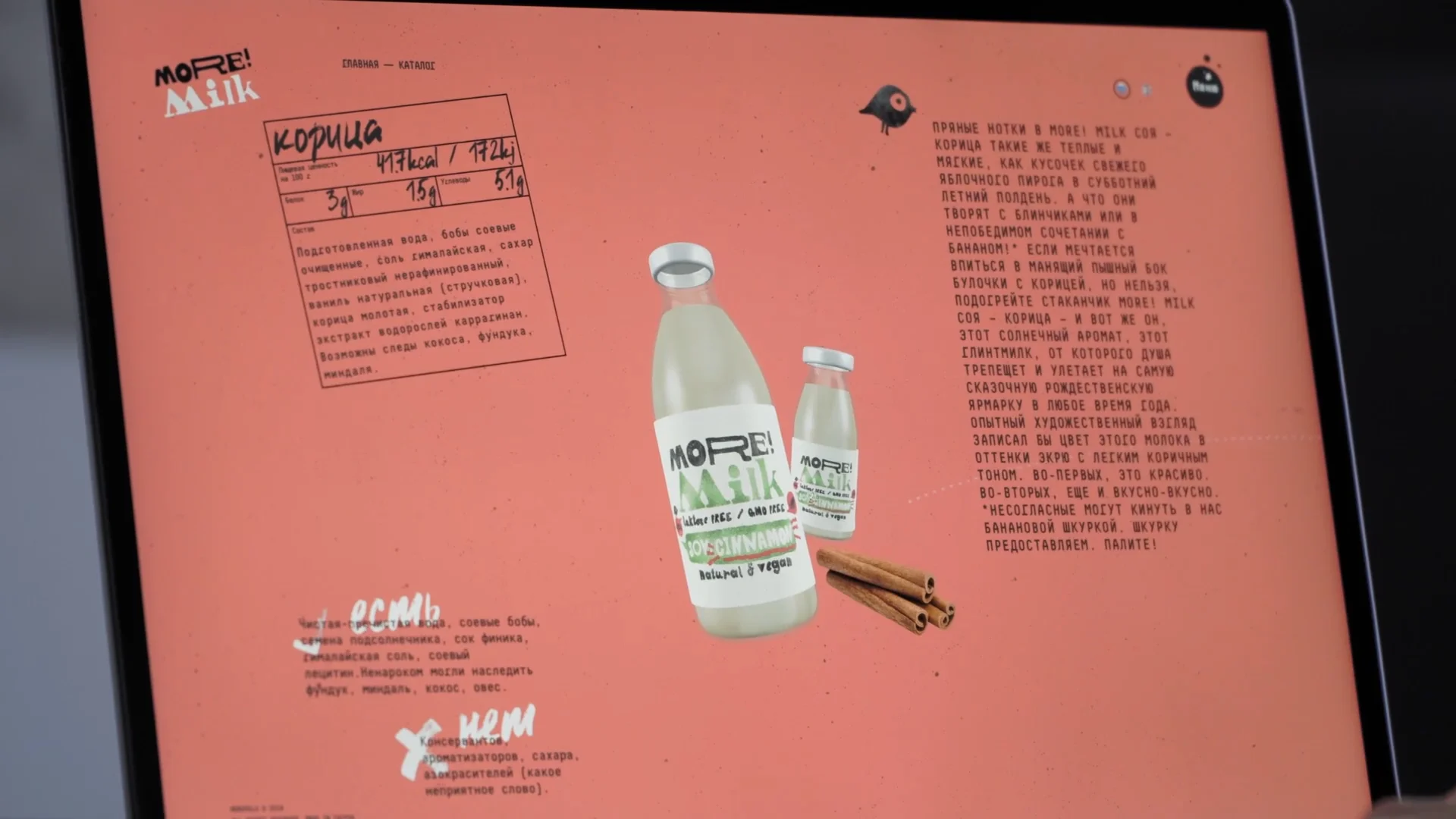 Следующим шагом стал проект Moremilk — серия молочных продуктов. На главной странице бутылки вращались по скроллу, в каталоге — крутились в слайдере, а в карточке продукта пользователь мог сам повертеть модель.